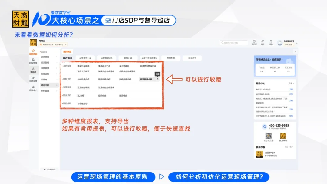 天財(cái)商龍龍巡店不僅可以設(shè)定個(gè)性化的門(mén)店SOP手冊(cè),高效完成巡檢,還可以通過(guò)巡檢沉淀的數(shù)據(jù),形成多維度數(shù)據(jù)報(bào)表,助力餐飲管理體系化。