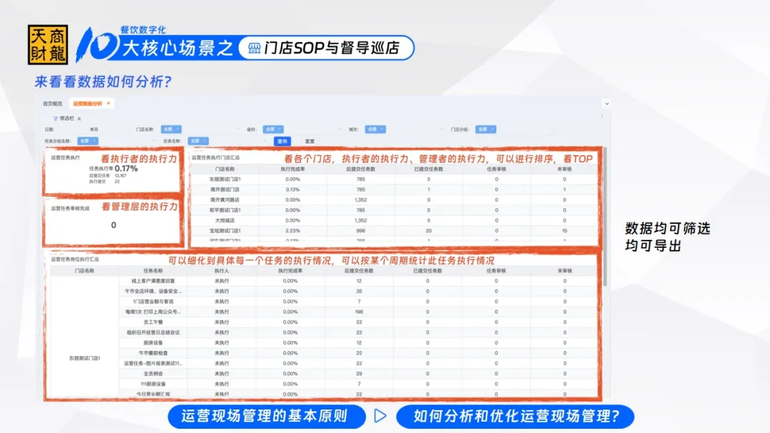 與傳統(tǒng)巡檢不同,天財(cái)商龍龍巡店可以通過(guò)可視化的形式呈現(xiàn)門(mén)店執(zhí)行力,不合格項(xiàng)可以直接追蹤到人。