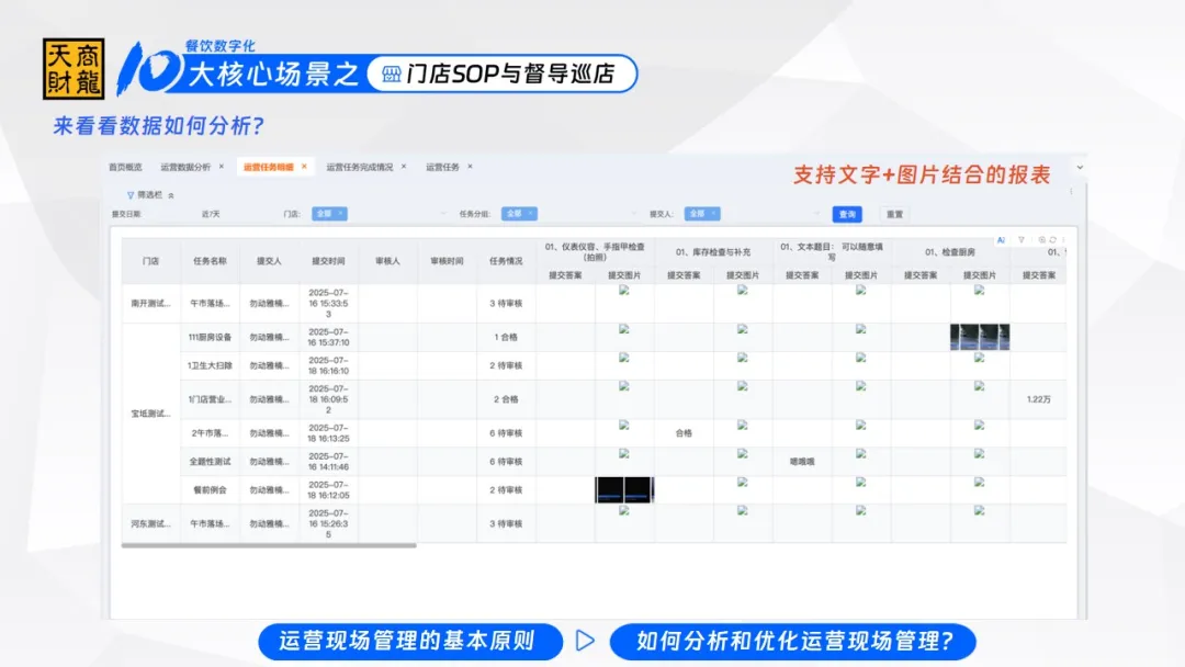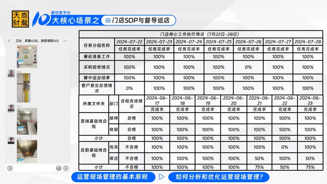 下圖中左側(cè)為某餐飲門(mén)店的督導(dǎo)發(fā)布的巡檢照片,但門(mén)店店長(zhǎng)及相關(guān)區(qū)域負(fù)責(zé)人很難一一查看。圖中右側(cè)表格,則是通過(guò)天財(cái)商龍龍巡店的報(bào)表,量化出的工作完成情況,由系統(tǒng)落實(shí)到人身上。