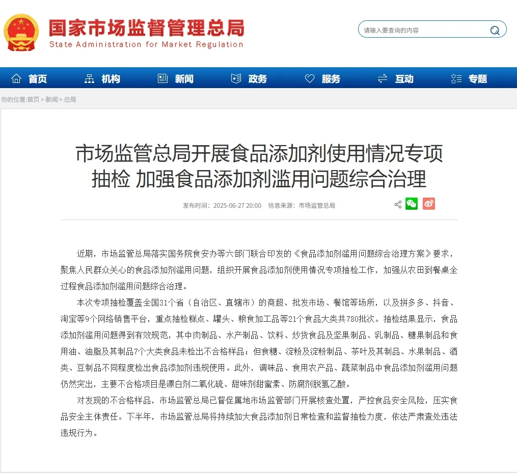 此外,國(guó)家市場(chǎng)監(jiān)督管理總局也已經(jīng)組織開(kāi)展食品添加劑使用情況專項(xiàng)抽檢工作。目前,全國(guó)各地都在落實(shí)執(zhí)行中。