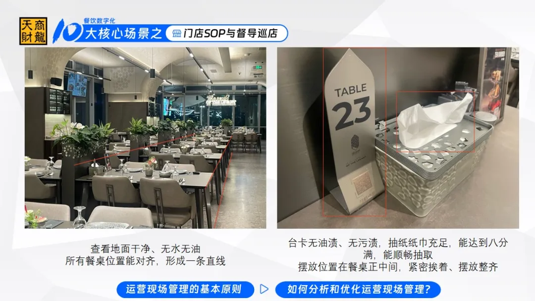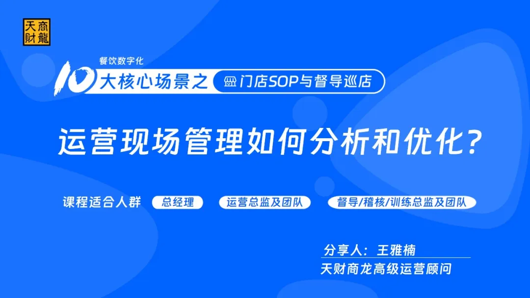 本次天財(cái)商龍餐飲研究院10大核心場(chǎng)景系列課程,天財(cái)商龍高級(jí)運(yùn)營(yíng)顧問(wèn)王雅楠老師,就從餐飲門(mén)店現(xiàn)場(chǎng)管理的分析與優(yōu)化視角,對(duì)如何做好門(mén)店管理、標(biāo)準(zhǔn)步驟都有哪些,進(jìn)行了詳細(xì)講解。