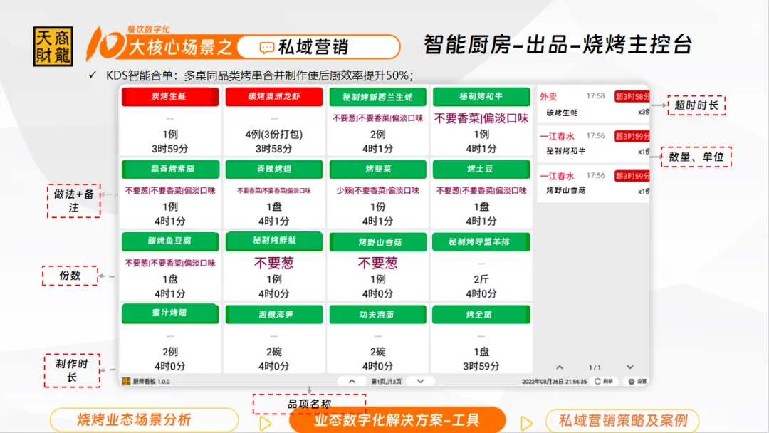 天財(cái)商龍燒烤業(yè)態(tài)解決方案通過后廚智能出品解決方案,通過KDS看板,全面串聯(lián)備餐-抓串-烤制-傳菜完整流程。