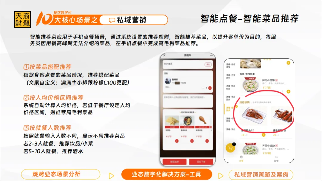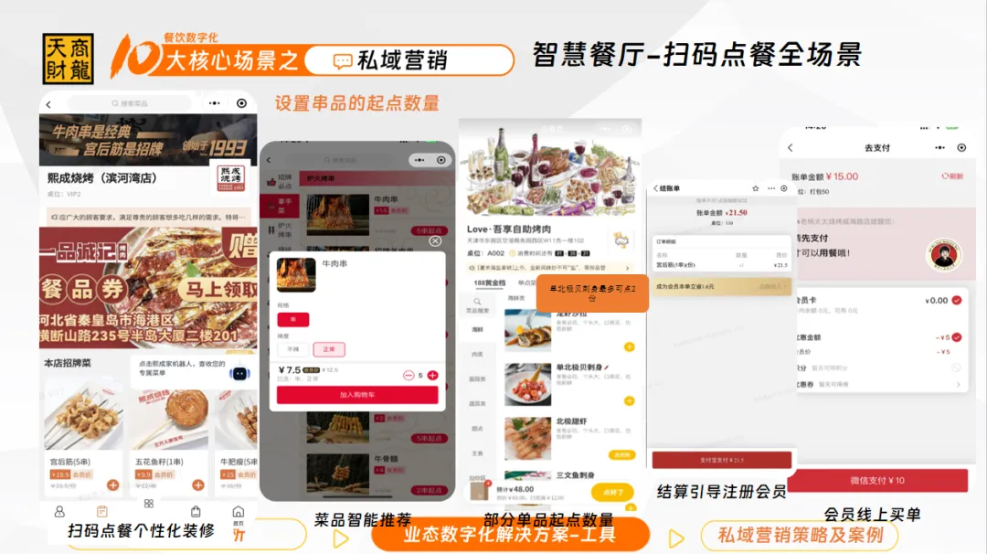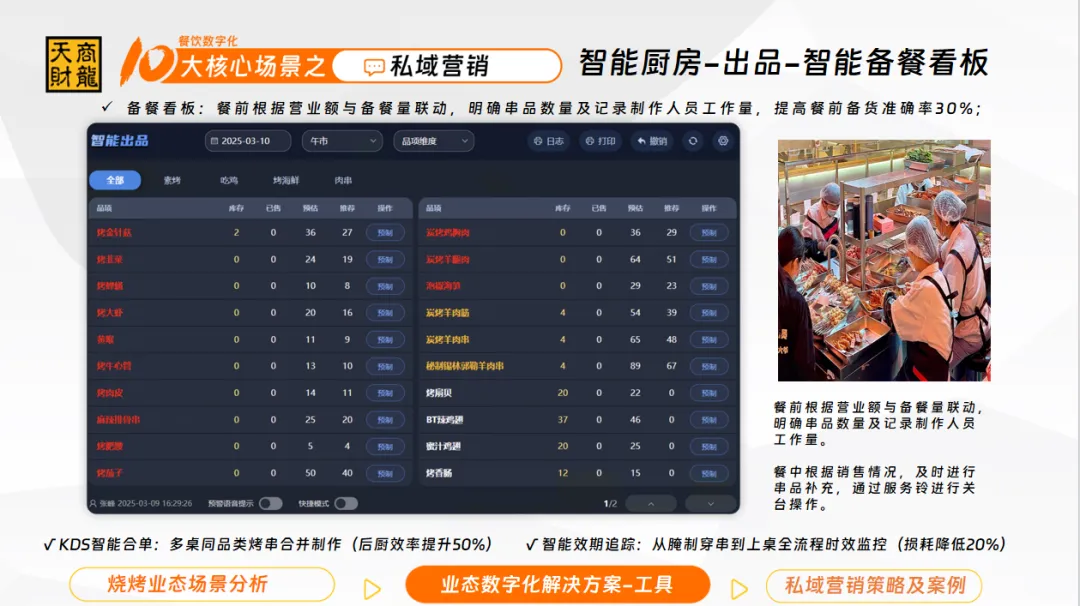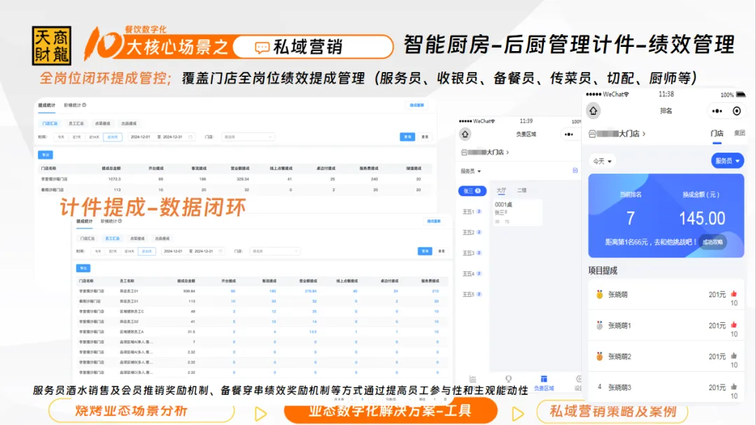 這些品牌之所以選擇與天財(cái)商龍合作,正是因?yàn)榭粗靥熵?cái)商龍對(duì)燒烤業(yè)態(tài)深刻的理解,這其中包括全域全平臺(tái)的引流能力、系統(tǒng)根據(jù)標(biāo)簽對(duì)會(huì)員分層進(jìn)而精準(zhǔn)營(yíng)銷的能力,更包括后廚高效、準(zhǔn)確出餐,以及解決后廚人員績(jī)效計(jì)算難題的處理。