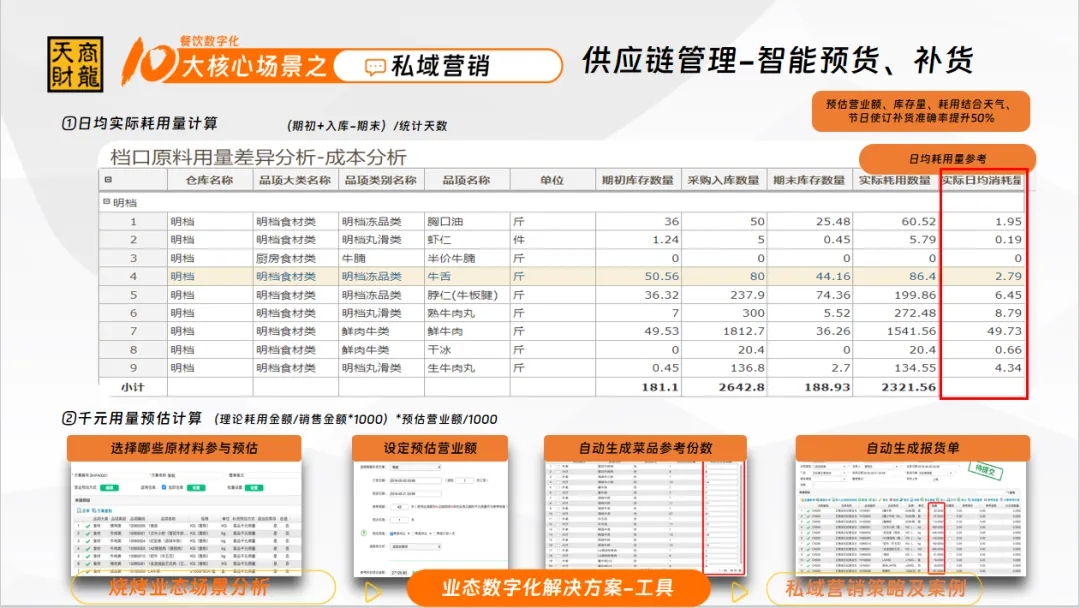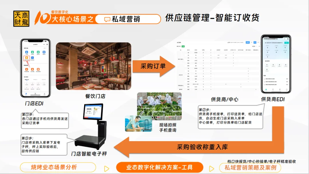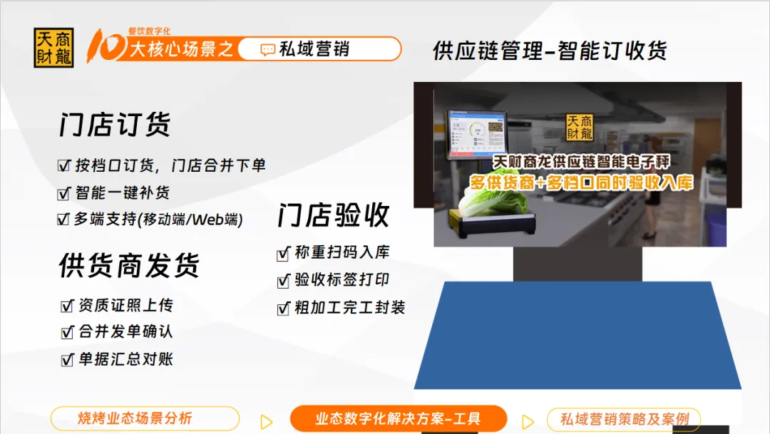 天財(cái)商龍燒烤業(yè)態(tài)解決方案,在管控食材上,就是在科學(xué)預(yù)估的基礎(chǔ)上,把供應(yīng)商協(xié)同一起拉進(jìn)來,把餐飲企業(yè)的資金流占用降下去。