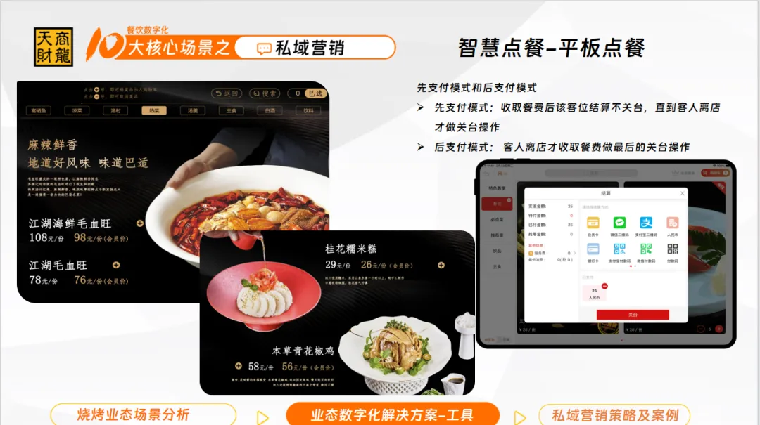 課程中,天財(cái)商龍高級(jí)運(yùn)營(yíng)顧問李茂賽老師,給出了目前燒烤業(yè)態(tài)的趨勢(shì)以及運(yùn)營(yíng)上的主要痛點(diǎn)。并針對(duì)性的給出了天財(cái)商龍的數(shù)字化解決方案。
