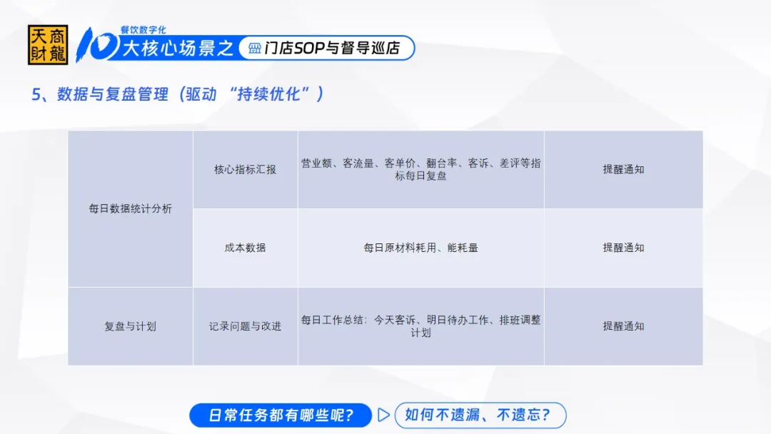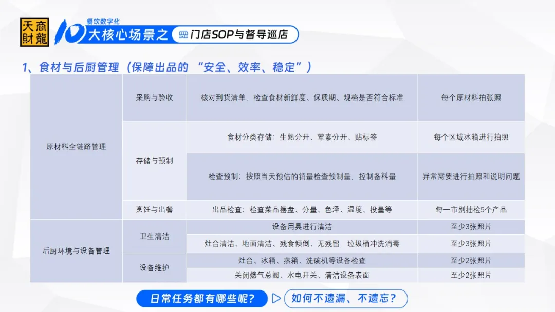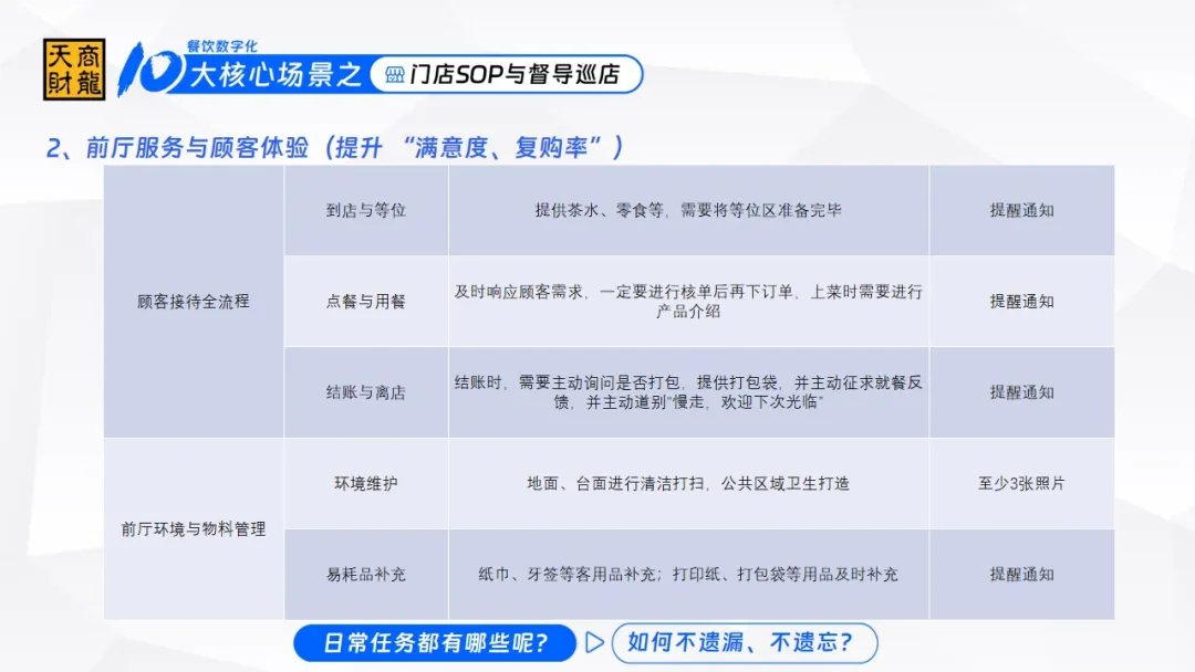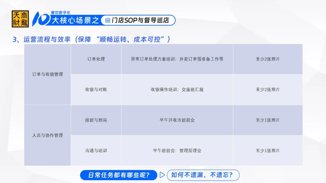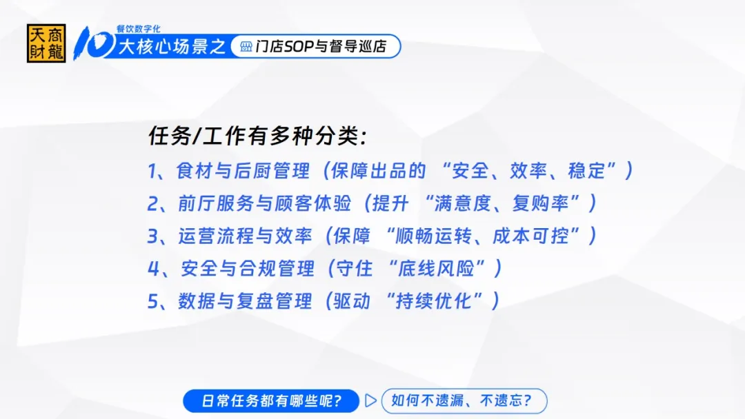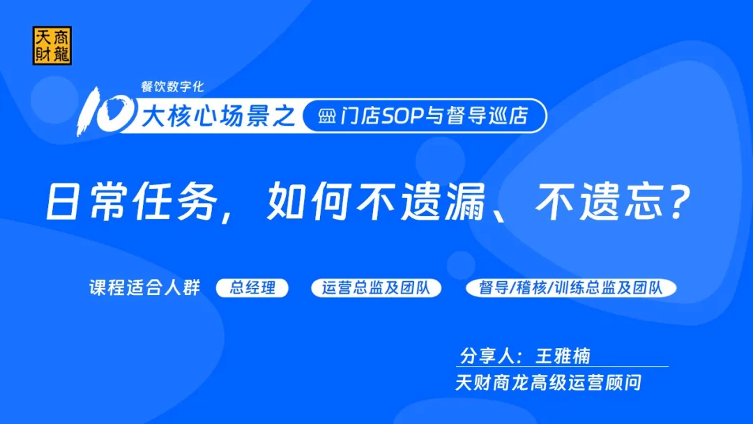 本次天財(cái)商龍餐飲研究院10大核心場(chǎng)景系列課程,天財(cái)商龍高級(jí)運(yùn)營(yíng)顧問(wèn)王雅楠老師,就將門(mén)店運(yùn)營(yíng)的日常運(yùn)營(yíng)管理進(jìn)行了分類(lèi),并給出了做到不遺漏的具體方法,以下就是本次課程的課程實(shí)錄。