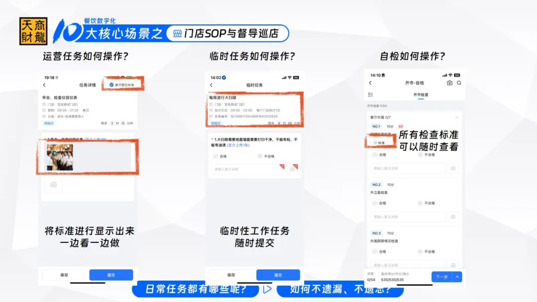 天財(cái)商龍龍巡店作為一款專(zhuān)為餐飲企業(yè)提供的門(mén)店運(yùn)營(yíng)&現(xiàn)場(chǎng)管理的工具,可以精細(xì)化的幫助門(mén)店各個(gè)崗位完成任務(wù)落地。