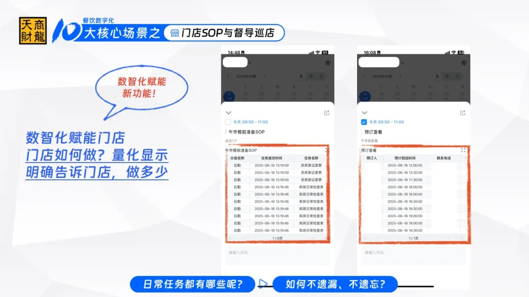 從被動(dòng)響應(yīng)到主動(dòng)執(zhí)行,從經(jīng)驗(yàn)主義到標(biāo)準(zhǔn)參考,再到 AI 建議,餐飲門(mén)店的任務(wù)管理正邁向數(shù)字化進(jìn)階之路。借助天才商龍的龍巡店和數(shù)字化門(mén)店等產(chǎn)品,結(jié)合企業(yè)自身流程和標(biāo)準(zhǔn),能讓門(mén)店業(yè)務(wù)更體系化,任務(wù)執(zhí)行更方便、高效。