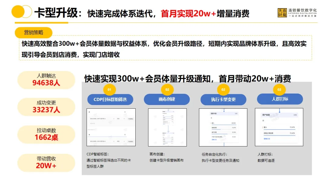 在這個(gè)案例中,這家餐飲品牌擁有300萬存量會(huì)員的龐大基數(shù),天財(cái)商龍MA系統(tǒng)僅用30天就完成了卡型升級(jí)任務(wù)。