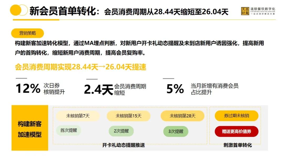 比如,某品牌用 MA 搭建 “新客加速轉(zhuǎn)化模型”:新客開卡后,未核銷第 7 天發(fā)送首次提醒,第 15 天二次提醒,第 28 天贈(zèng)送更高價(jià)值券。通過動(dòng)態(tài)喚醒,會(huì)員消費(fèi)周期從 28.44 天縮短至 26.04 天,當(dāng)月新增有消費(fèi)會(huì)員占比提升 5%,次日券核銷率也提高 12%。