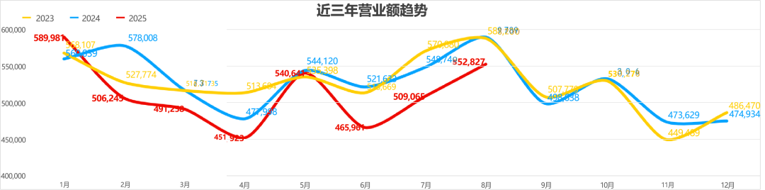 2025年1-8月,餐飲行業(yè)在外部環(huán)境與內(nèi)部結(jié)構(gòu)調(diào)整的雙重影響下,呈現(xiàn)出營業(yè)額整體承壓、業(yè)態(tài)分化明顯的運行特征。從門店存活率來看,2025年1-8月存活率為85.5%,較2024年同期的83.6%和2023年的77.3%有所回升,表明行業(yè)整體韌性仍在。但店月均營業(yè)額數(shù)據(jù)顯示,2025年前八個月店均營業(yè)額約為51.03萬元/月,較2024年同期的54.2萬元/月下滑5.3%,較2023年54.1萬元/月也有明顯下降。特別是6月以來,受相關(guān)政策與環(huán)境變化影響,營業(yè)額下滑幅度擴大至7.15%,顯示出短期內(nèi)經(jīng)營壓力顯著提升。