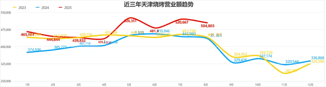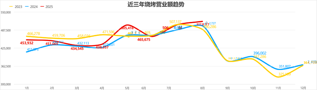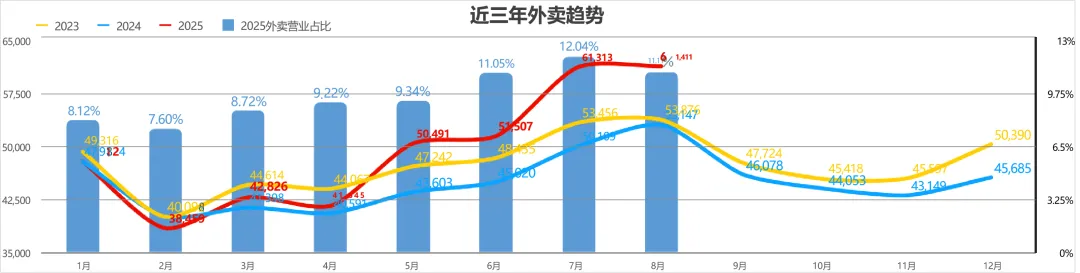 ?燒烤業(yè)態(tài)表現(xiàn)亮眼。2025年1-8月營業(yè)額較2024年同期增長4%,雖然受季節(jié)性影響顯著,但整體經(jīng)營相對穩(wěn)定。外賣業(yè)務近三年持續(xù)增長且連續(xù)創(chuàng)下新高,2025年店均外賣營業(yè)額約3.5萬元 / 月,不過受 “煙火氣” 消費場景限制,外賣尚未實現(xiàn) “質(zhì)變”。8月后燒烤業(yè)態(tài)將進入傳統(tǒng) “冬眠期”,后續(xù)經(jīng)營面臨考驗。