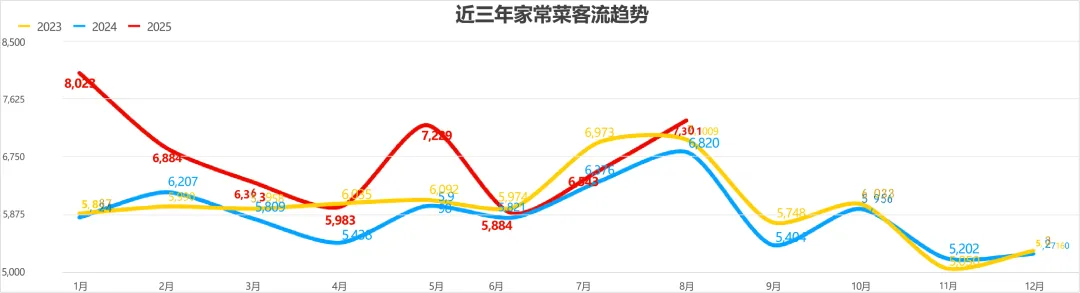 ?家常菜業(yè)態(tài)相對平穩(wěn),營業(yè)額較2024年下滑2%,較2023年下滑3.5%??土髁空w穩(wěn)定,波動幅度在1.5%以內(nèi)。人均消費持續(xù)下滑,預計將穩(wěn)定在75-77元/人區(qū)間。