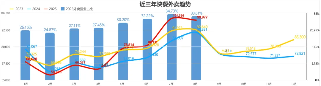 ?正餐業(yè)態(tài)經(jīng)營壓力最為顯著。2025年1-8月店均營業(yè)額為94.5萬元/月,較2024年同期下滑4.6%,且波動性明顯增大。自5月起下滑幅度進一步擴大,6月后同比下滑超10%。與此同時,正餐業(yè)態(tài)客流下滑5.6%,6月后下滑幅度更達到9.8%。人均消費也呈現(xiàn)下滑趨勢,較2024年下降近10元/人,顯示出正餐業(yè)態(tài)在客流量、消費頻次和客單價三個方面同時承壓。不過,正餐業(yè)態(tài)在外賣賽道持續(xù)突破,2025 年外賣營業(yè)額增長幅度超 38%,盡管受限于業(yè)態(tài)特性,但也為其開辟了新的增長空間。