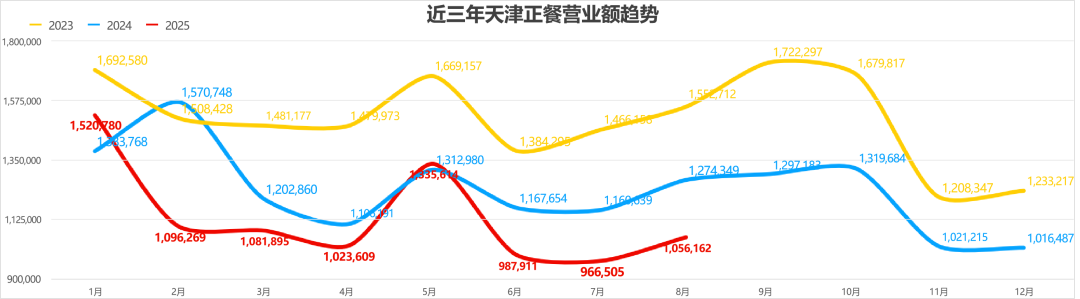 ?天津正餐業(yè)態(tài)連續(xù)三年持續(xù)下滑,2025年較2024年下滑10%,較2023年下滑超25%??土髁客瑯酉禄?,較2024年減少5%,較2023年減少12%。人均消費波動約20元/人,較2024年下滑3元,較2023年下滑9元。